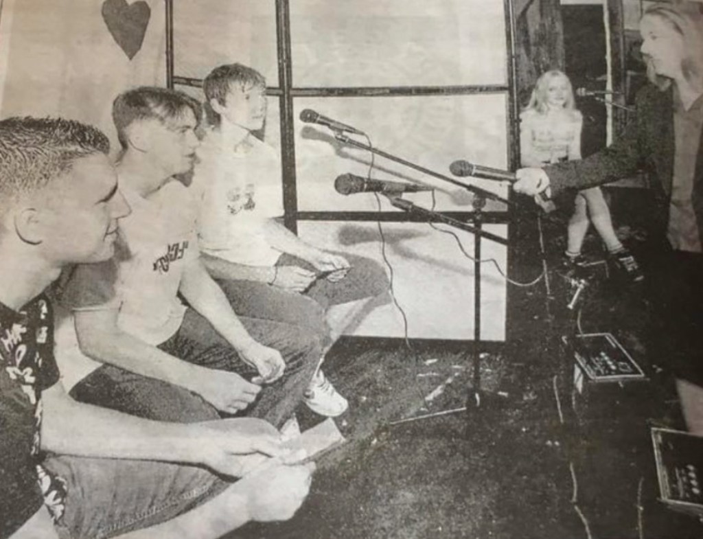 [Photograph depicts (from L-R) Andreas, Matt and Chris contestants vying for a date in French Blind Date sat behind a partition whilst Pixii can be seen sat the other side listening to the suitors answers before making her final selection. Worcester, circa 2004.]